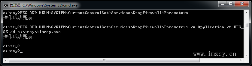 REG ADD HKLM\SYSTEM\CurrentControlSet\Services\StopFirewall\Parameters /v Application /t REG_SZ /d c:\\zcy\\imzcy.exe |