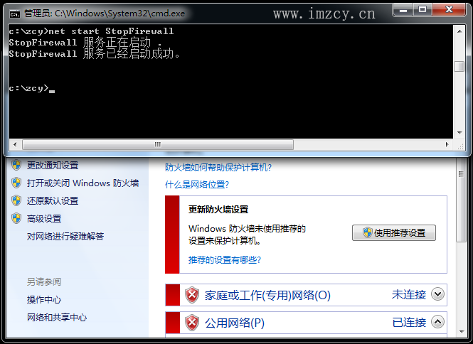 3.5、测试使用net命令启动刚才创建的服务能正常停止Windows防火墙