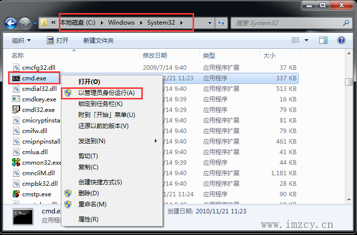 3.2、打开C:\Windows\System32目录,找到cmd.exe程序,右键以管理员身份运行