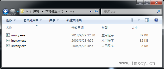 3.1、在C盘下面新建一个文件夹zcy,将转换好的imzcy.exe程序及下载的instsrv.exe和srvany.exe都复制进去