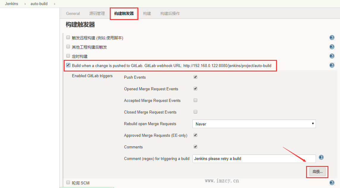 2.4、在构建触发器这里,选择[将更改推送到gitlab时构建],记得新建个记事本复制后面的网址等下要用到